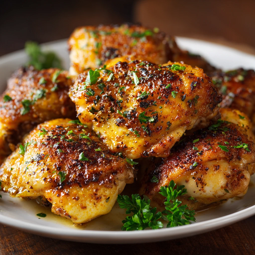 Garnish your baked chicken thighs with fresh herbs, such as parsley, thyme, or rosemary.