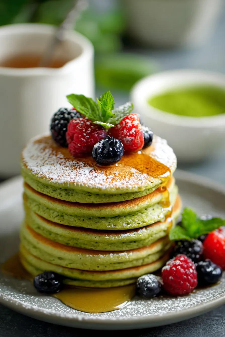 - Step 8 Serve immediately with your favorite toppings such as maple syrup, fresh berries, whipped cream, or a dusting of powdered sugar. Enjoy your vibrant and fluffy Matcha Green Tea Pancakes!