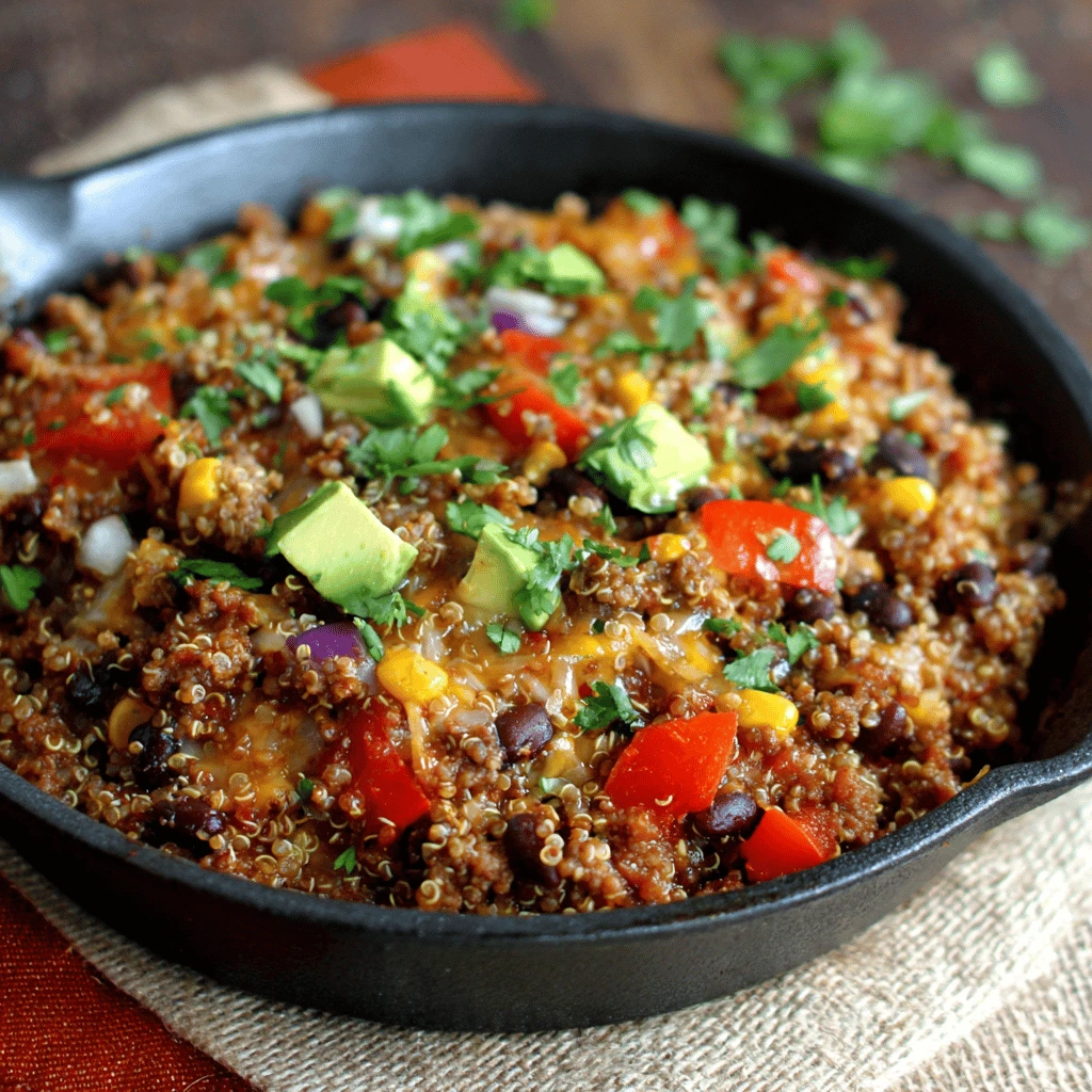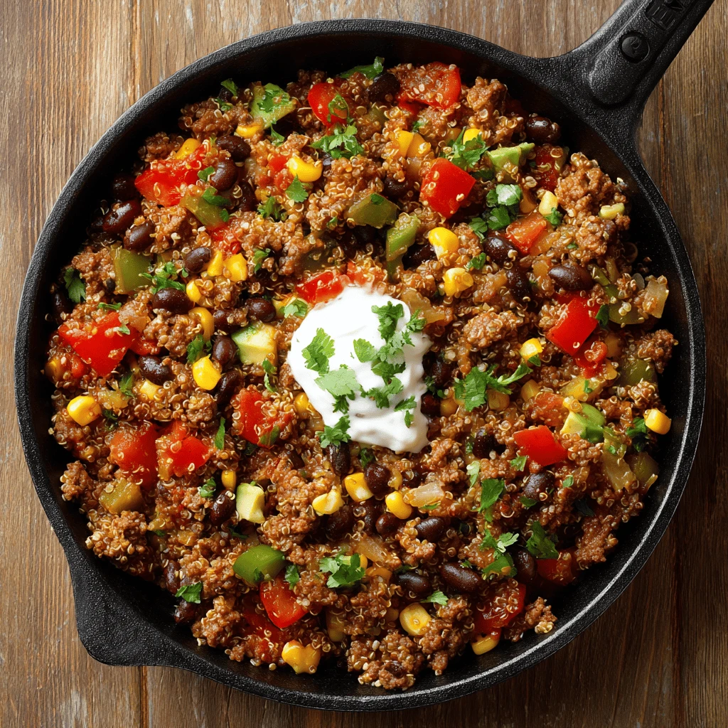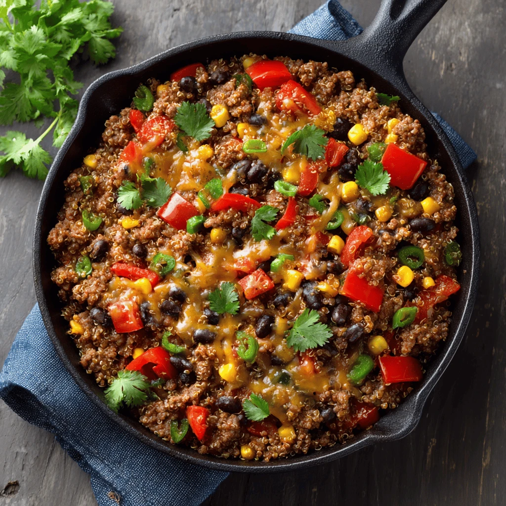 Quinoa is a complete protein and a great source of fiber. Combined with lean ground beef and plenty of vegetables, this skillet provides a balanced and nutritious meal.