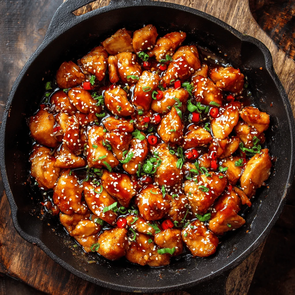 Once the chicken is cooked through and the sauce has thickened, remove the skillet from the heat. Garnish with sesame and sliced scallions for added flavor and visual appeal. Serve immediately over rice, noodles, or roasted vegetables.