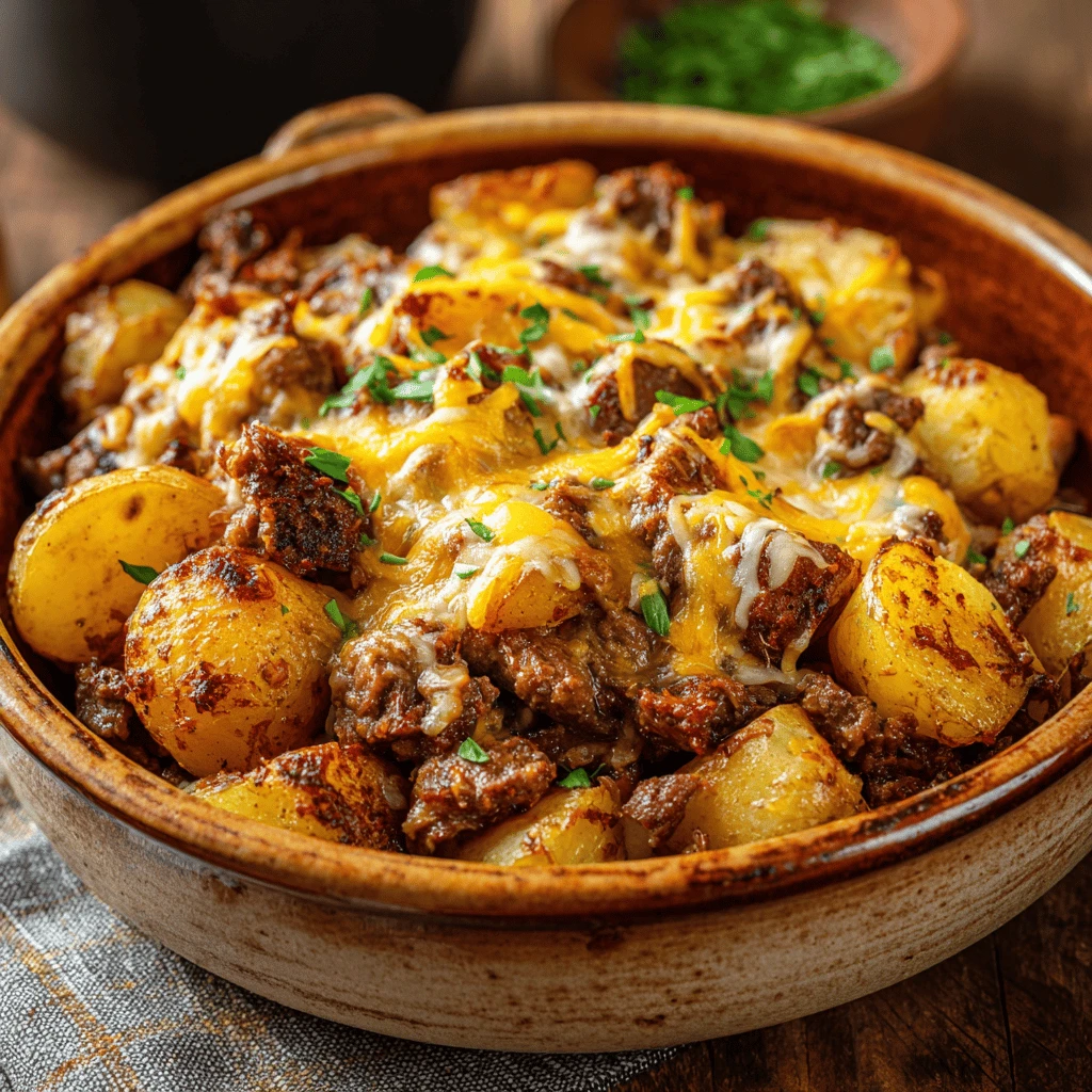 4. Layer the Ingredients: In the slow cooker, layer the potatoes, browned beef, and onion-garlic mixture.